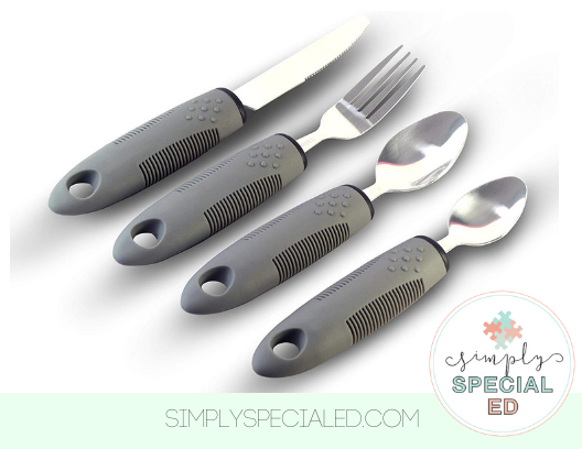 ADAPTED CUTLERY: This adapted cutlery set offers a more stable grip to standard cutlery. The handle allows a person to grip even when wet.