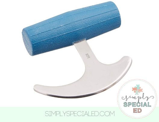 ROCKING KNIFE: This knife has a large grip friendly handle and allows a person to rock back in forth with one hand in order to cut independently. If you can only get one adapted tool- this is the one!