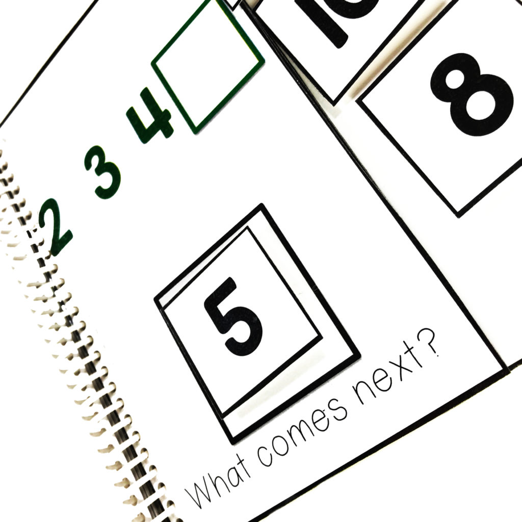 By (DATE), when given 3 sequenced numbers student will find the number that comes next from a field of 10 with (% accuracy and % independence) as measured by teacher collected data.