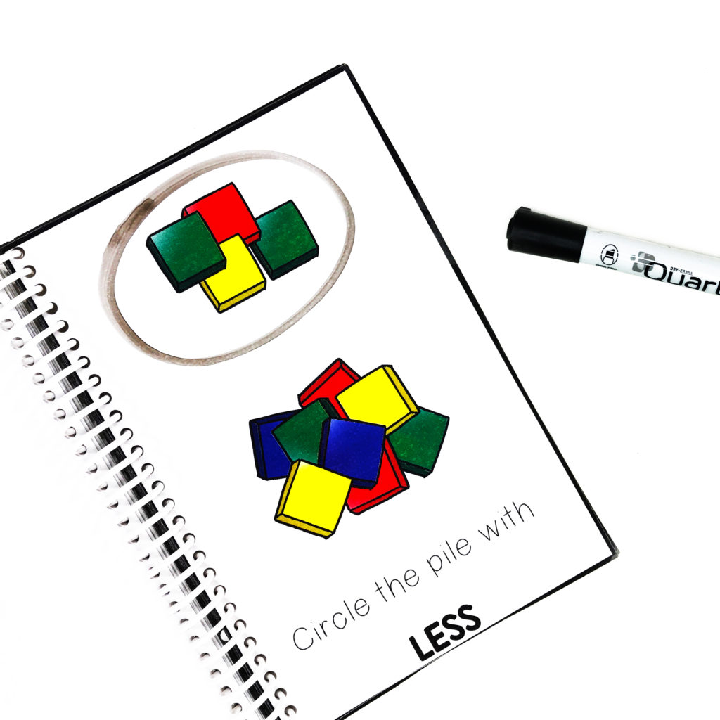 By (DATE), when given the word more or less, student will match the correct pile by circling the answer with (% accuracy and % independence) as measured by teacher collected data.