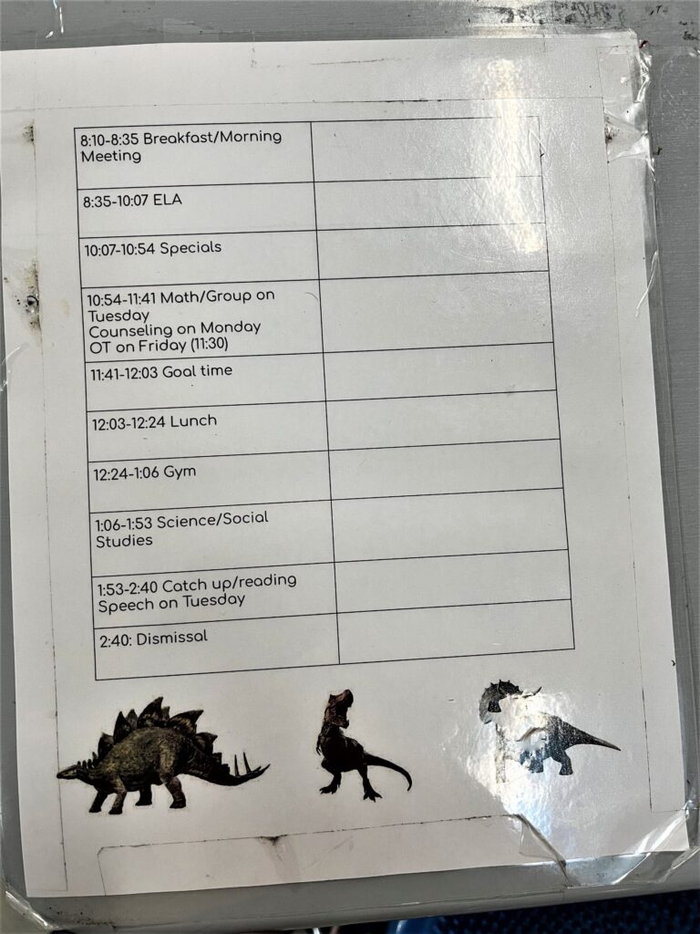 Pictured above is a schedule that one of my students keeps on his desk that he checks off throughout the day. It includes our daily schedule along with his pull outs (and its dinosaur themed- dinosaurs are his favorite!)
