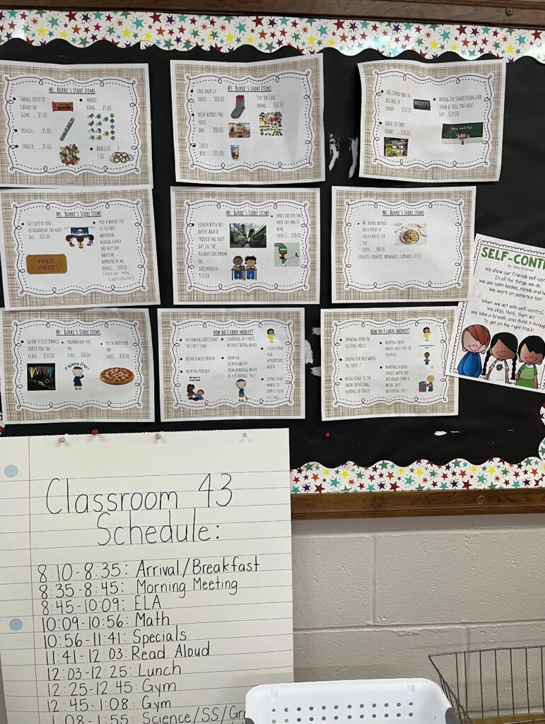 Above is the area where students can see the daily calendar, our daily schedule, as well as information about my class store. The posters explain what items/rewards they can buy at the class store (anywhere from $5 for a pencil to $50 for a class pizza party). They also explain how students can earn money (doing their daily jobs, being a good friend, showing honesty, etc.).