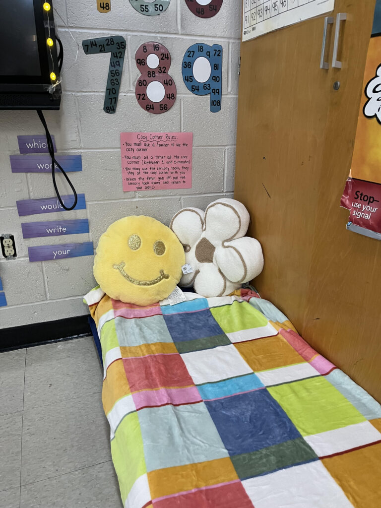 Pictured above is my “cozy corner”, along with the rules for using the cozy corner posted on the wall above it. They must ask to use the cozy corner, they must set a timer between 1-5 minutes, they may use sensory toys while in the cozy corner (located in a drawer next to the corner, which contain materials like kinetic sand, sensory bottles, etc.) When the timer goes off, they must clean up and return to what they were doing. I explain to students that the corner is there for them if they need a break due to being tired, upset, etc. You can find a free checklist on SSE here to help you prepare this same type of space in your classroom!