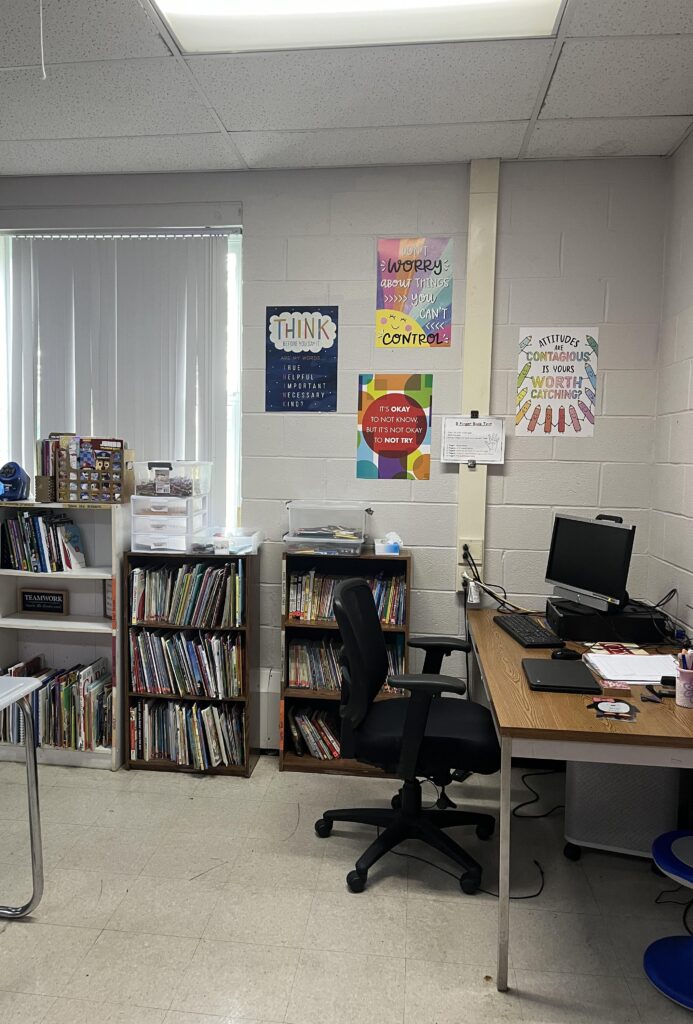 This area of the classroom consists of the bookshelf filled with books students can read, along with coloring books, and another desk area for a 1:1 aide.