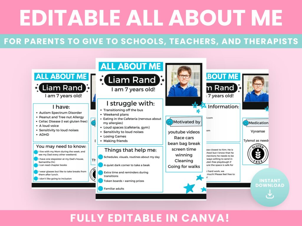 An All About Me Sheet is a way for special needs parents to share important information about their child with special ed teachers, therapists, caregivers, or daycare workers. It is a great way to put all important information in one place that can be shared with all staff to ensure your child is getting the most out of their time there.