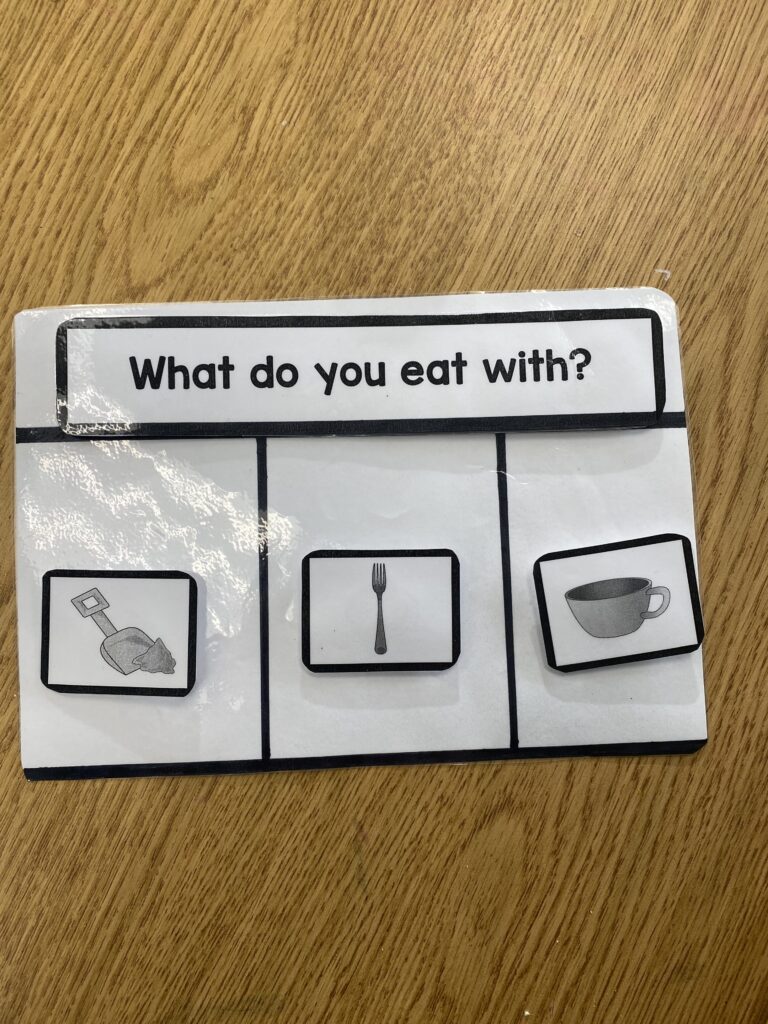 When wanting to focus a student’s attention to a particular target, you can use a visual prompt. My favorite way to do this is black Post-It notes. (affiliate link) Unlike other sticky notes that are usually bright colors, these are dark, opaque and allow me to block the responses I do not want my students to see, while not distracting them. Taking the questions that the student was struggling with and covering the incorrect/distractor choices, I made an errorless version of these key ring cards. As the student learns the correct response, I will reintroduce the distractor stimuli one at a time.