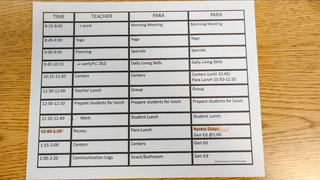 First and foremost, before I do anything else, I draft out a schedule. I start with my non-negotiables, such as lunches, recesses, arrival, dismissal, related services, and specials. From there I can add in my other activities for the day. Unfortunately, day-to-day schedules look different based on related service provider schedules, so I have to prepare for that.