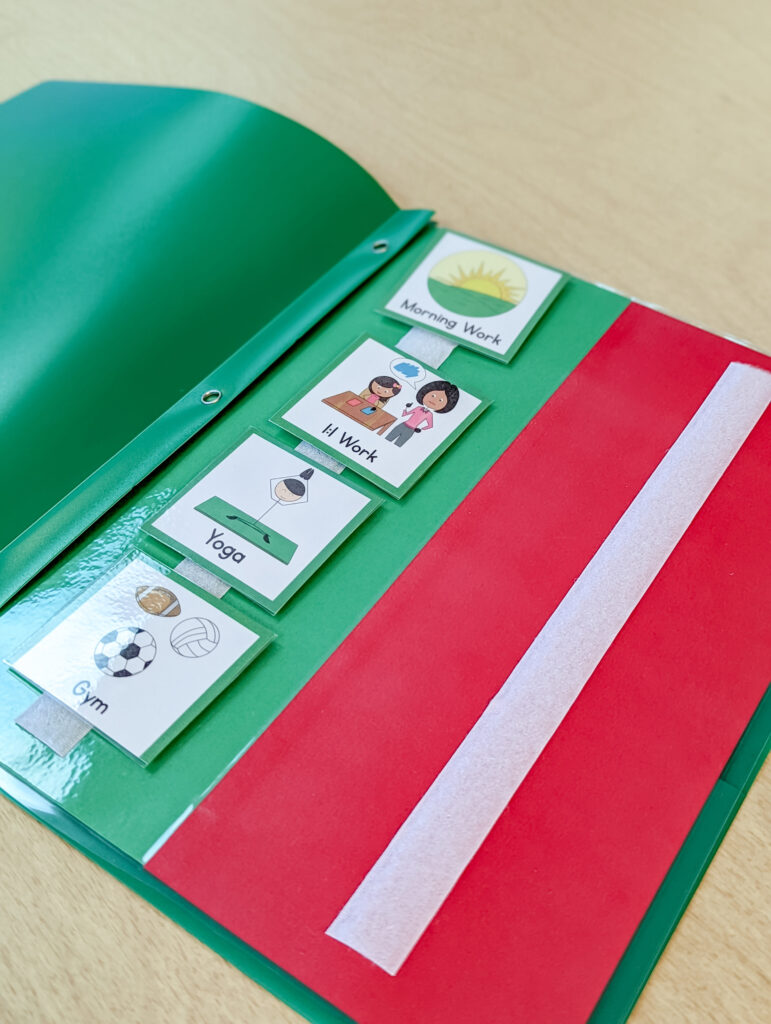 The second type of schedule I utilize in my classroom is a travel schedule. The students who use this type of schedule are traveling outside of my classroom often. This schedule travels with them and is updated as necessary throughout the day. When a center or activity is complete, the students move the schedule piece from green to red to indicate that it is “all done.” This is the same concept as the schedule my other students use, except this is portable while theirs is not.