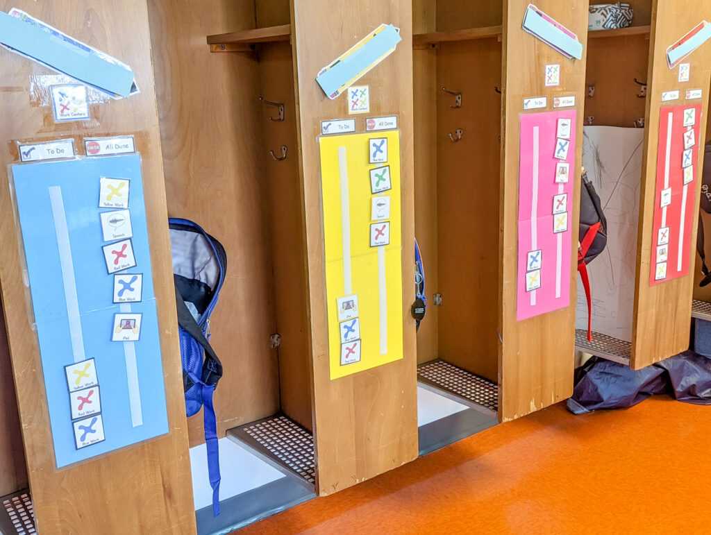 I utilize two different types of individual student schedules in my classroom. The majority of my students use a “To Do/All Done” schedule. On this type of schedule, all of the schedule pieces start on the left side, and as the student finishes a center, they move that piece to the right. In the photo above you’ll see that the students have completed five center rotations. They each have three rotations remaining for the afternoon center rotations. At each center, I have a larger visual of the center color that is visible to the students so that it is easier for them to find where they are to be at that time. Their schedules are located at a central location within the classroom, and each student schedule is placed outside of their locker/cubby so they are able to easily find it.