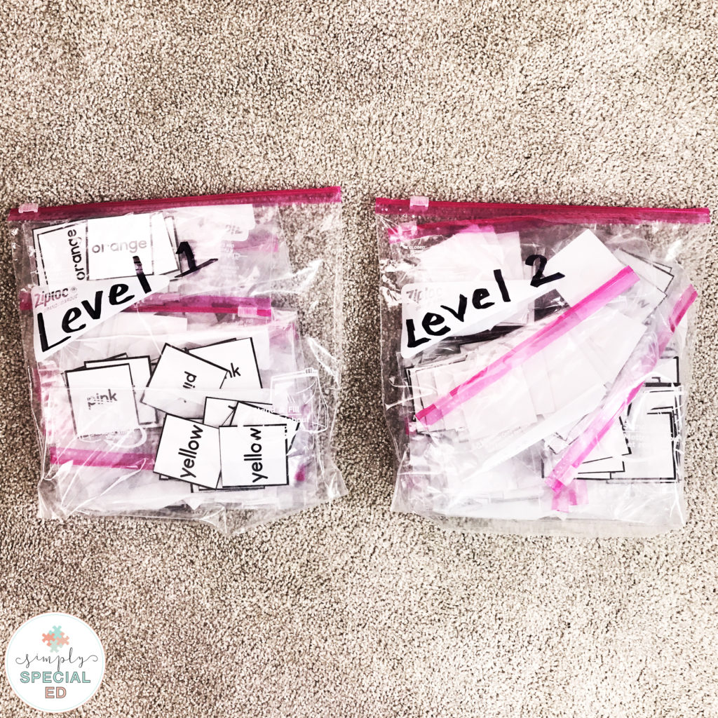 Levels 1 and 2 also come with the option of having just words and picture and words. This gives you even more leveling options even within the levels! I store each books in a small baggy and then put all of one level in a larger baggy. If I have a student using these I would store the pieces in a bin next to where I store the books they are working on.