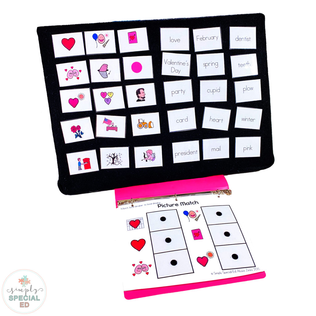 Velcro boards are used to display the “pieces” of the students task box in a direct way… it keeps the pieces from falling off the desk, practices the fine motor of pulling the pieces off, and displays them in an upright way which is important for a lot of our learners. You can see a tutorial about how make this in this blog post.