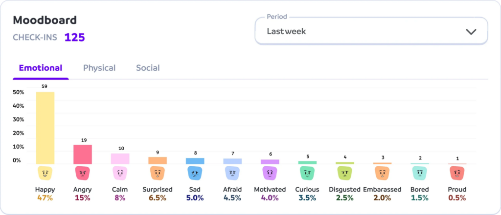 Along with the video lessons, Moozoom also includes mindfulness activities, as well as a daily mood check in. You can enter in the names of your students and have them answer how they are feeling today by choosing an emotion.