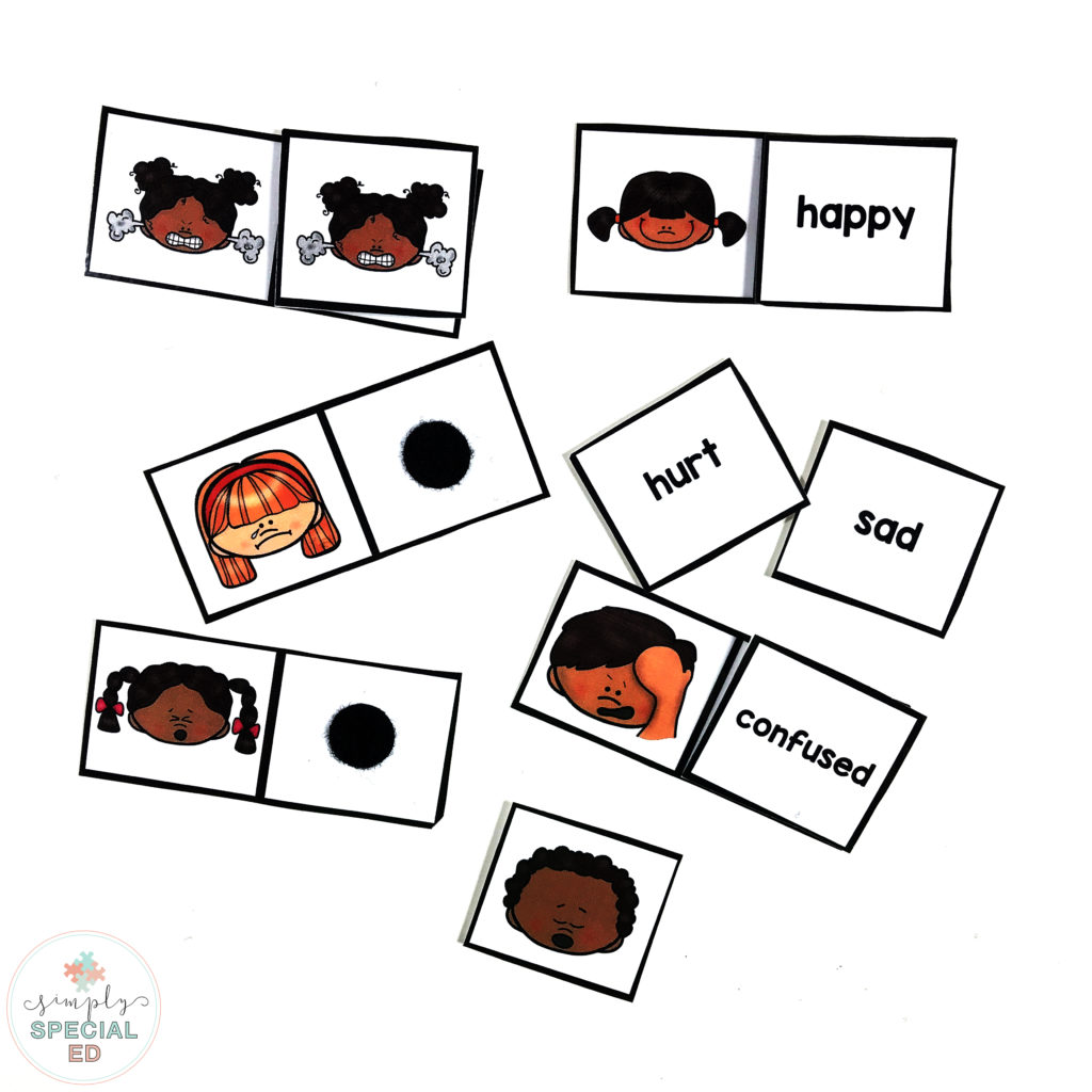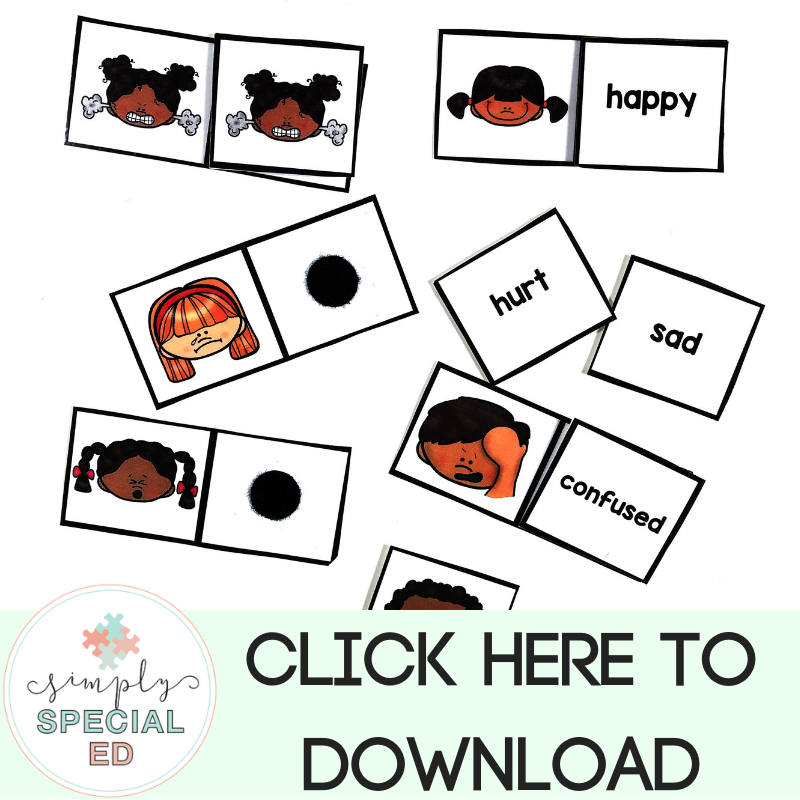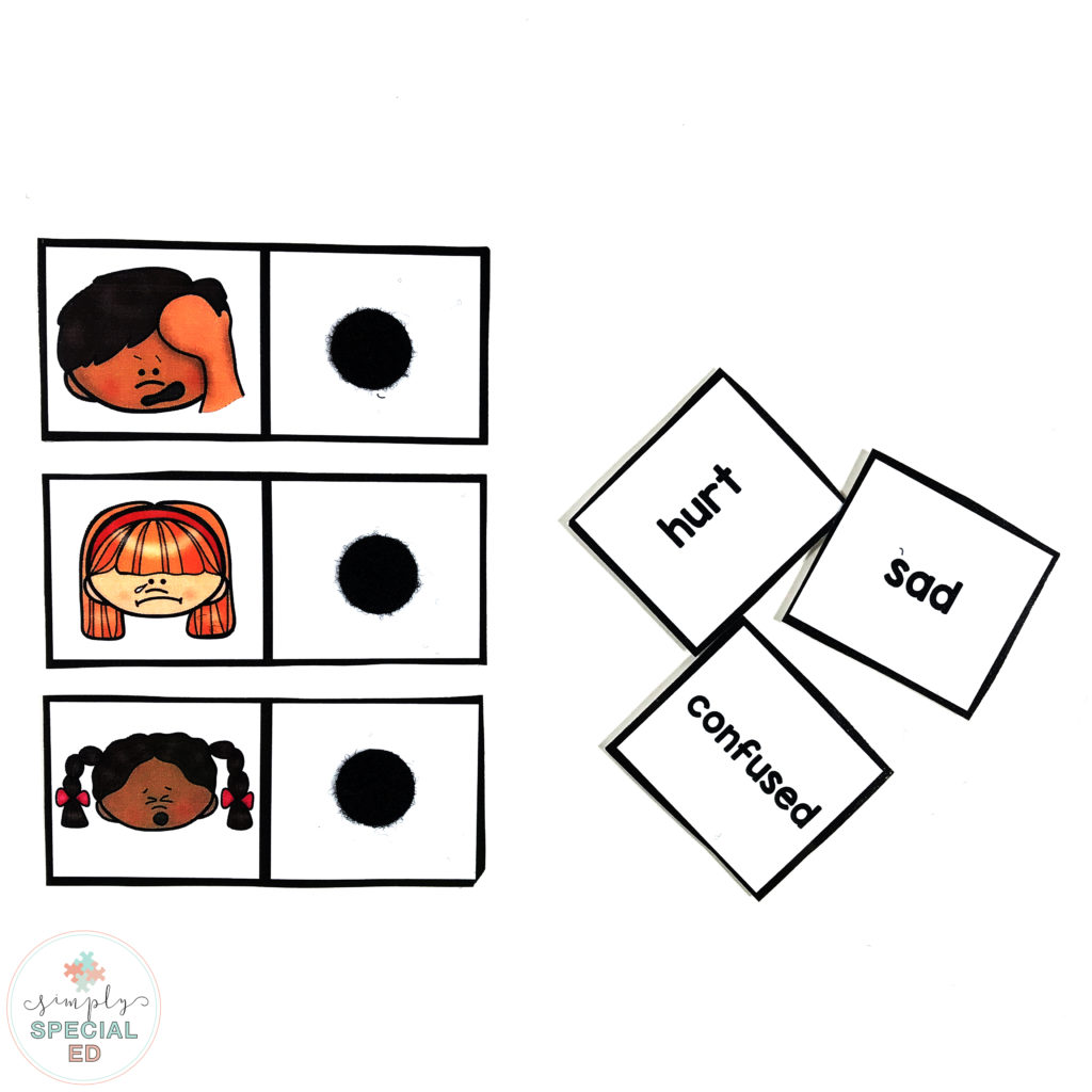 Teaching feelings and emotions are hard. Though this task doesn’t directly teach the way they feel… it is a great matching task to pair with social stories or books that work on emotions.