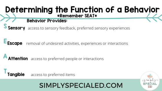 Once you have ruled out a medical need as the function of the behavior, you only have four other options. They create the acronym SEAT. Remember, the function of the behavior is WHY the student is emitting this behavior.