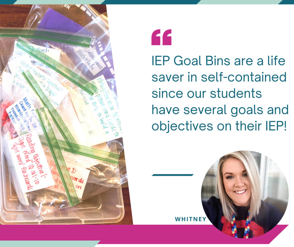 “IEP Goal Bins are a life saver in self-contained since our students have several goals and objectives on their IEP! Go through each student’s IEP and gather all materials needed to monitor each of their IEP goals and objectives. Organize the materials into baggies and label with the objective it is for and instructions on how to collect the data. Label the materials in the bin the same way on your data sheets. You will save so much time and energy collecting data each week with your students!” – Whitney