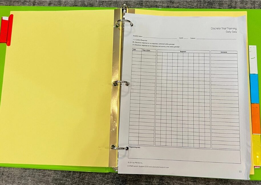 I create a binder for my whole class rather than creating a binder for each student. This works for me because I only have about 6 students in my classroom. Often, they are also working in the same lesson. This allows me to store the materials all in one binder rather than searching through multiple binders and the kits. I create a tab for each student and use sheet protectors in front of each data sheet. Typically, I work on 3 lessons at a time per student (3 data sheets and 3 sheet protectors per student). I store the picture cards in the sheet protectors that correspond with the lesson. If you’re needing help getting a binder organization system in place, check out How to Organize Data for IEPs.
