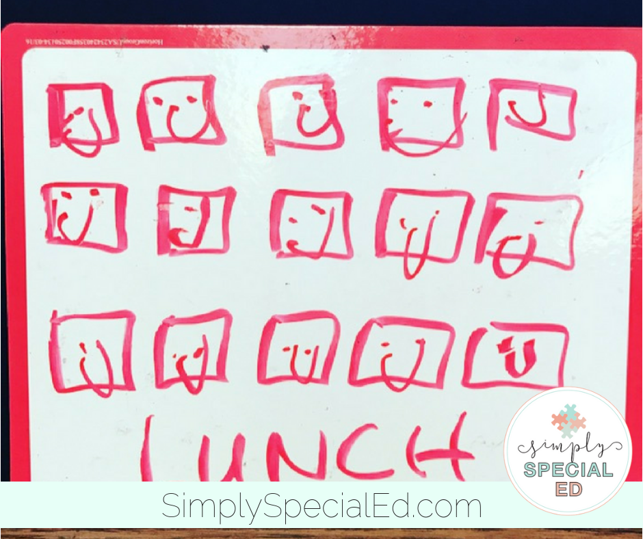 Token boards on the go are important too! Sometimes you may be without your token board and need to think on the fly. You can basically make a token out of anything… but a dry erase board is a great idea! This student gave himself smileys to make it through art class and get to lunch!