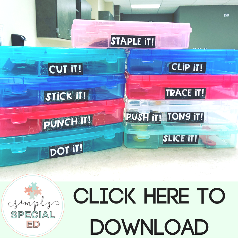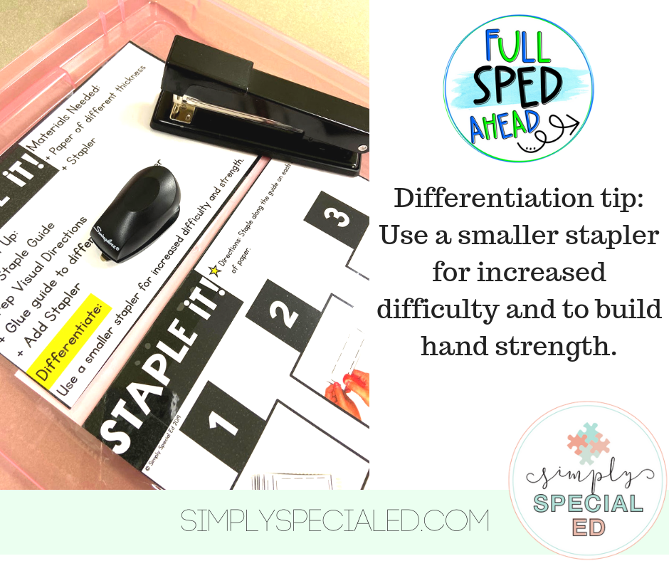 Once I was able to put the specific materials in each box, I had to teach my staff and students how to use them. I grabbed one box each day and taught them in a whole group setting, this way I was able to determine how much differentiation and support each student needed. For example, in my hole punch box, I have a hole punch that is a one-finger push and another one that is a full hand grasp (typical hole punch). For stapling, I have a large stapler and small stapler.