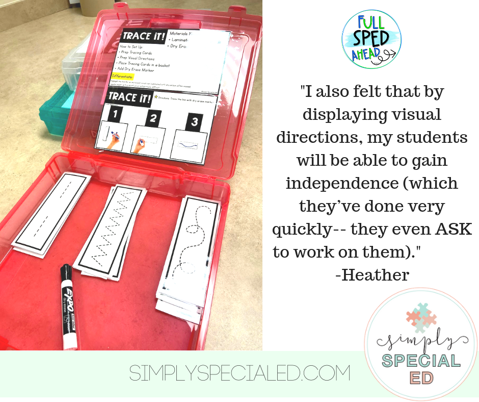 I laminated the teacher’s directions and visual directions for each box. I felt this would be helpful for assistants, substitutes and related service members to look at and be able to quickly instruct when needed. I also felt that by displaying visual directions, my students will be able to gain independence (which they’ve done very quickly– they even ASK to work on them). The teacher’s direction page made it quick to see what materials I needed and I was able to grab them in my room or purchase them at the Dollar Store. Low cost tasks are my favorite!!
