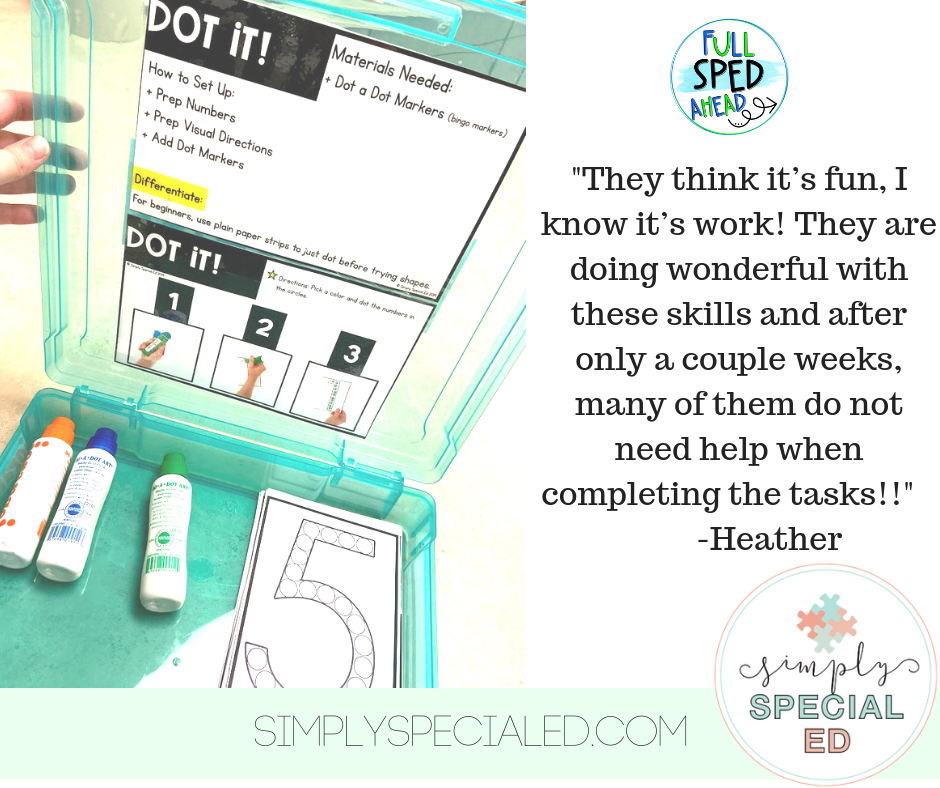 Now, I have a proud teacher moment, I did not teach this, but when there is downtime during the week and my students are in between activities or are on a break, they will grab a box and work on the chosen task until the next activity. Let me repeat that, students are CHOOSING to do WORK when they are on a BREAK!!! They think it’s fun, I know it’s work! They are doing wonderful with these skills and after only a couple weeks, many of them do not need help when completing the tasks!! Major teacher points right there!!