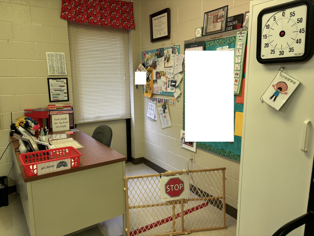 In the break/free choice area, we have a comfy chair, a swing (students LOVE the swing), a small LEGO table (that they also love), and a shelf of preferred items. I’ve also placed some of our favorite sensory items in this area like the bubble tower and galaxy lights, as well as a mirror with built-in LED. Even though we are in a Junior High Classroom, I wanted to incorporate the things my students like for incentives. We still have lots of plastic animals, cars, and puzzles.