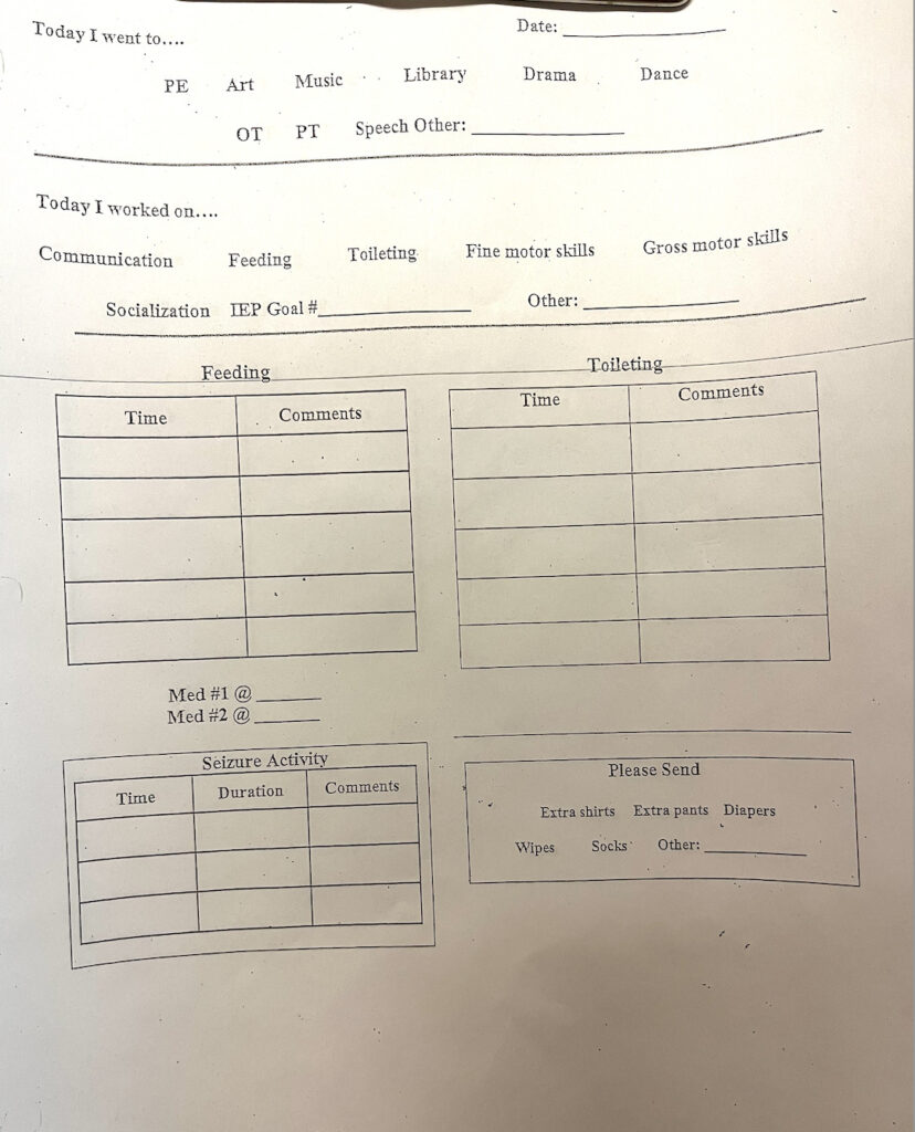 Another example of family communication is the above photo. This shows the Essential Skills daily sheet. This shows families a snapshot of their students day at school. It details what elective they went to, therapies, IEP goals targeted, feeding and toileting information, medication administered, seizure activity, and any extra materials needed. Finally, at the bottom we write a blurb with a personal narrative about their students day. Finally, in Essential Skills we believe it is important for our students, regardless of their communicative status, to be able to go home and share what they did at school.