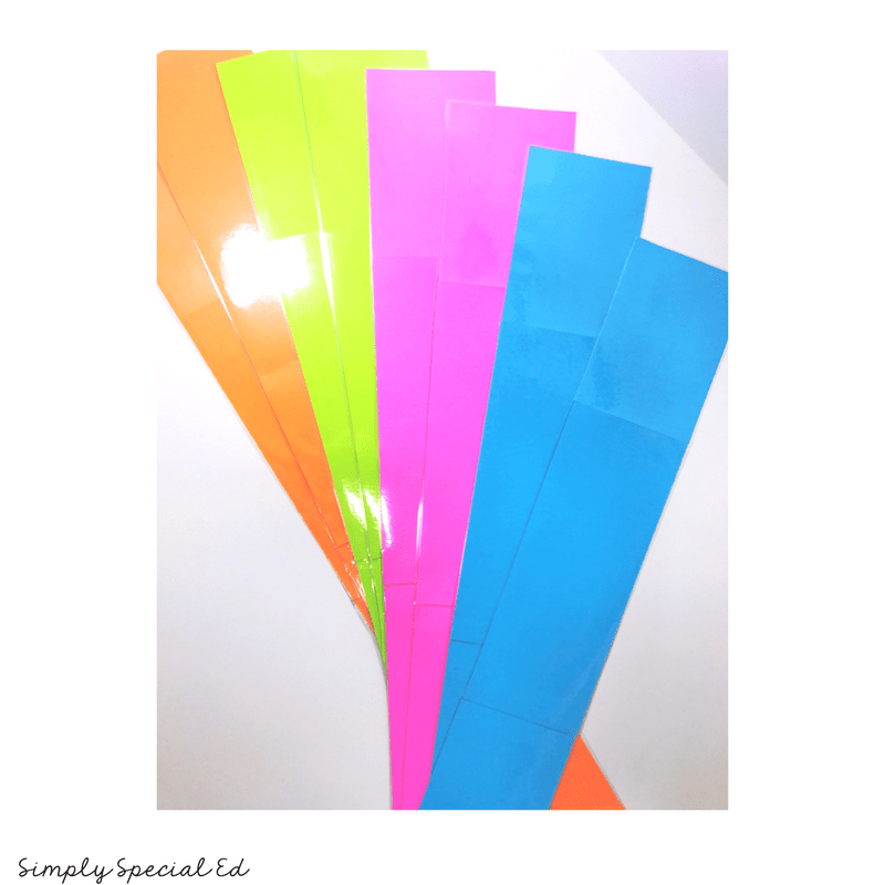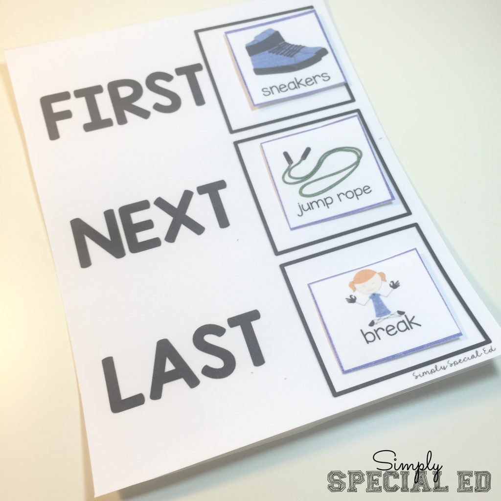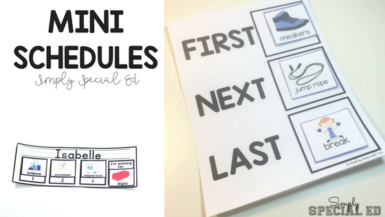 Mini schedules have multiple uses. If your student has graduated from needing a very detailed structured schedule, but sometimes still needs the extra support… this is a great option. For instance: if gym is really hard and causing a lot of behavior… you can utilize the specials first next last board or a paint stick schedule (paint sticks are free at any paint store)- these usually only have a few activities on them and end with a break. It helps the students regulate themselves and gain a better sense of time.