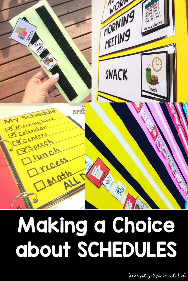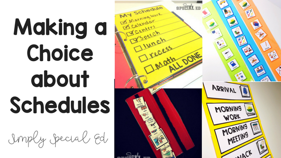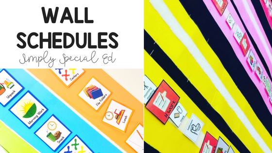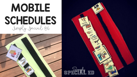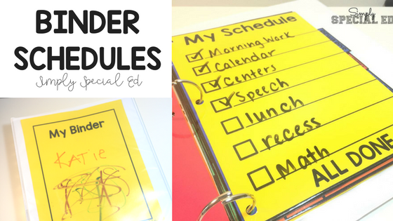 I am absolutely in love with binder schedule. Mostly because it is so much more than a schedule. I include ALL student visuals in the binder. All types of schedules/ first then boards… and if a staff member is primarily utilizing it… behavior plan info, data info, IEP, notes. It’s perfect when students are moving from staff to staff or just moving around the building often. Keep everything in one place. You can find my Simple Success Student Binder here, and read about it here.