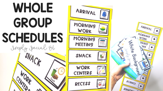 I ALWAYS have a whole group schedule in addition to individual schedules. Some kids may need both, some might not be able to utilize the whole group schedule yet (but staff needs it), and some are ready to just use a general schedule of the day. ((common theme: you know your students best)) But, I will say that I believe all classrooms benefit from a whole group schedule to go over during morning meeting, and have something to refer to throughout the day. BUT- do not let this schedule become wall decor. + I have some tips on how to make it interactive and student centered here.