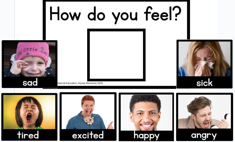 For younger students and students that need a more basic type of share question, you can have students share how they are feeling today. This slide from SSE shows a simple, easy way to do that.