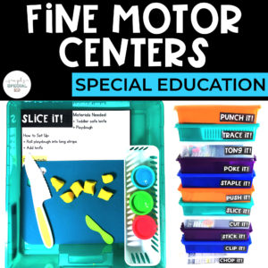 Math, fine motor, library, writing, puzzles, and science are some of the most popular centers in special education classes. As an Early Childhood Special Education Teacher I know that centers are the way children learn and grow. The first step is to decide how many centers you will have in your classroom and how often will you change them. In my Pre-K class, I’m required to have a minimum of eight centers but my co-teacher and I have more. In my lesson plan, I have a table (shown above) with the center names and activities available at each center. Ideally, I have 2-3 activities at each center to allow more than one student at the center.