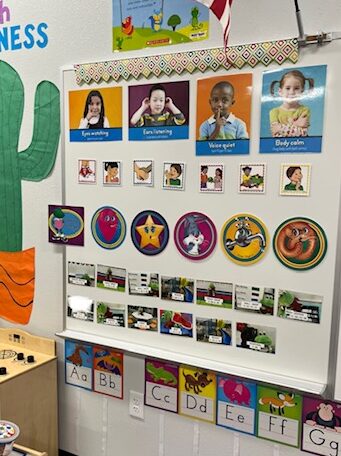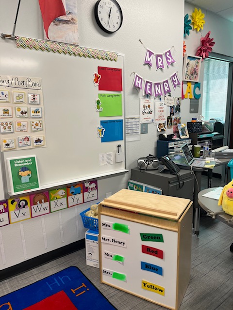 Above you see our color coded small group set up. Matching bins are on a counter where it is easily accessible for the teacher to grab. In the photo, also see song board, more visuals and where we put our objectives. Additionally, my desk and “all about the teacher’ bulletin in included above. As we all know, pre-k teachers don’t really sit, it is really there for after school and planning. My co-teacher has a desk as well right next to mine.