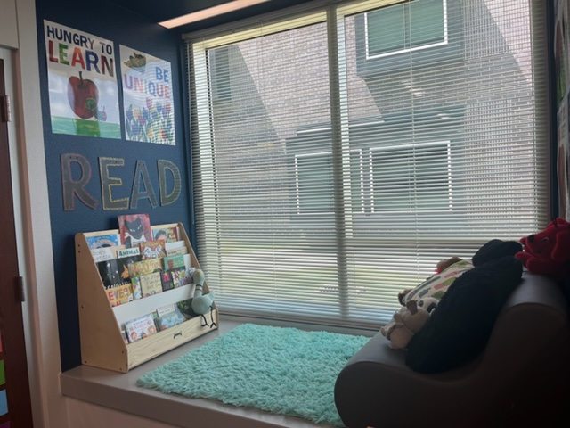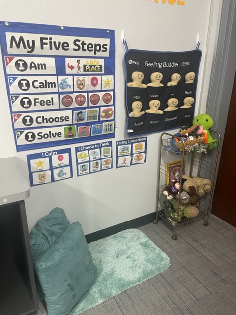 Our cool down area, or calm area in our classroom. This area is optional and only offered to students that seem like they need a break or are overwhelmed. In fact, whenever a student is I will sit with them and provide the student with visuals or tools to help he or she explain their emotions at the moment and really self regulate. This area has so many resources for the students. For example, we have sensory items, stuffed animals for comfort, visuals for describing emotions, visuals for how to regulate that specific emotions (feeling buddies) and truly so much more.