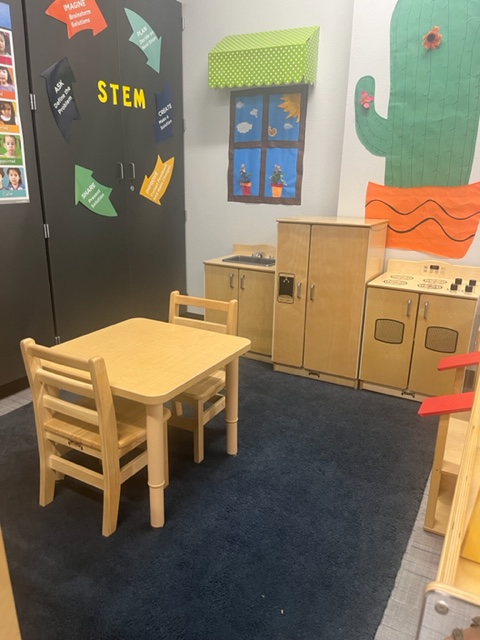 Playing is so much fun in pre-k! The students love the dramatic play area. My teacher assistant did an amazing job with the window. Ideally, we have about 4-5 students here at one time. Right now, we do not have a lot of kitchen toys and accessories out because we are still learning center rules and expectations. I also have a dollhouse, car garage and other fun dramatic play centers open.