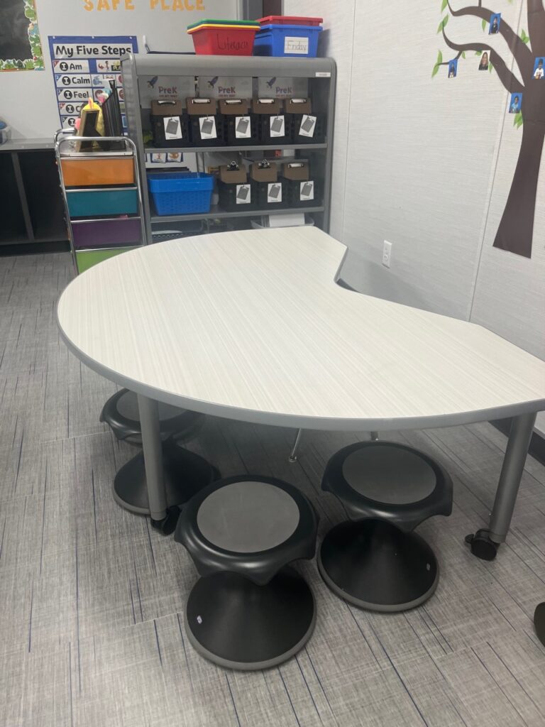 Little chairs, little tables and cute little toilets. The tables are color coded and are used as centers and for small groups. The kidney table is used as a writing center and doubles a small group as needed.