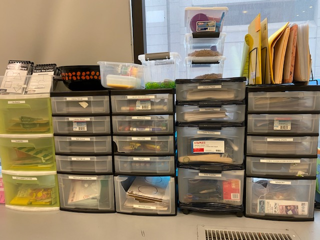 The plastic tubs are in lieu of cubbies during COVID-19.