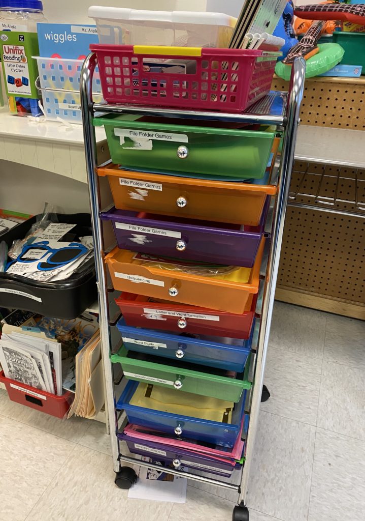 In the physical space, I ensure that everything my students would need (books, learning materials, art materials, etc.) are at eye level and labeled. I also ensure that the bins I use are clear and/or colorful so that I can refer to colors when giving directions for students to retrieve their own materials. Students preparing their own materials not only helps them build independence, but I am also about to assess their ability to understand two step directions and their knowledge of prepositions! (Use this SSE resource to teach prepositions!)