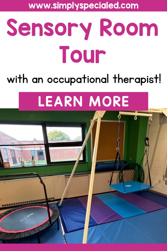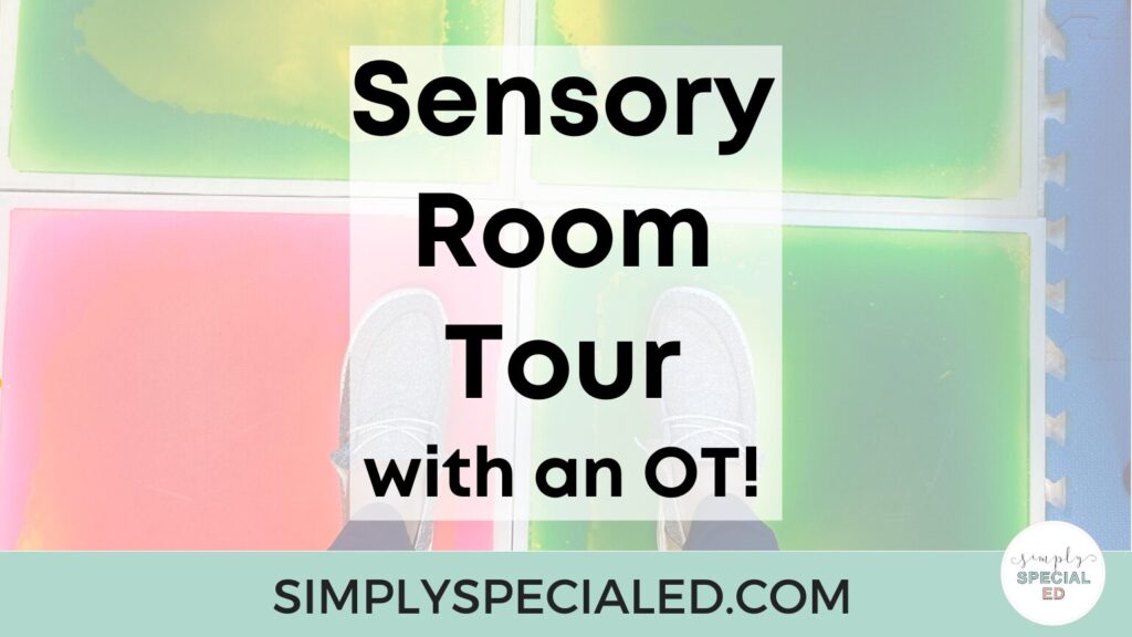 I am in the unique situation of having a sensory room in each the building at my school district. These rooms serve as the occupational therapy (OT) and physical therapy (PT) treatment spaces as well as a space for students to take breaks. We house much of our sensory-based equipment [that often get’s handed out for classroom use] here as well. Check out some of the pictures and descriptions below to “tour” one of our sensory rooms. Check out my blog on 15 “must haves” for a sensory room! It details what some of my top picks would be in an ideal world!