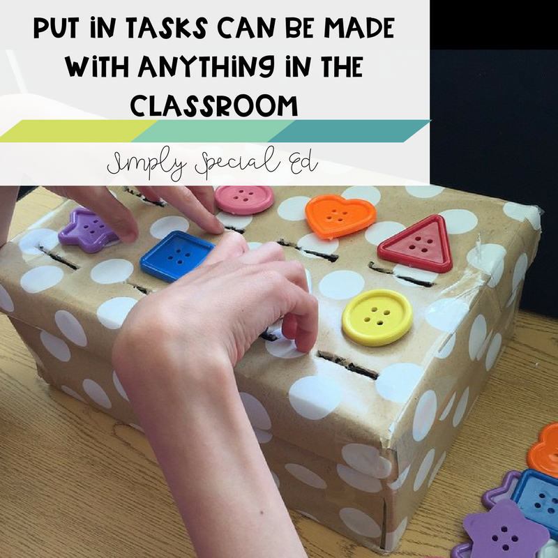 Put in tasks are so easy to make. Cover any shoebox with wrapping paper, and put holes in the top the size of your pieces. You can literally use ANYTHING for the pieces. I love these buttons because we can sort by color and shape for those who can, or we can use it as a simple put in task. The more pieces you have the better, especially for trying to build hand strength, attention to task, and focus!