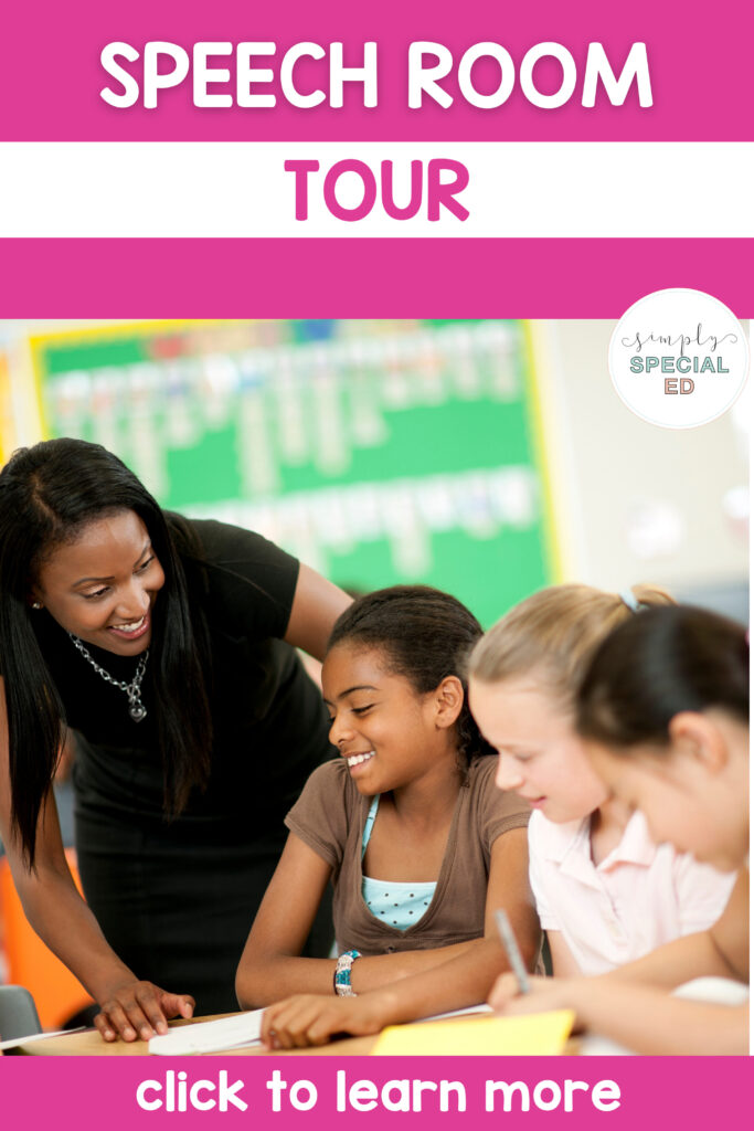 Hi! Welcome to my speech therapy room! I work at an elementary school in California. I am lucky to have a decent sized speech room. My room is not closet sized like some speech therapy rooms, but it’s not classroom sized either. I share the space with two amazing full time SLPAs because my caseload is huge!
