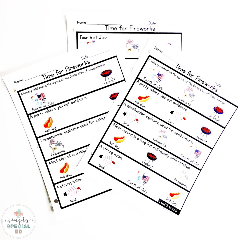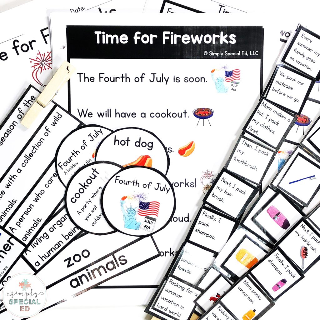 Simple Comprehension is one of my favorite ways to target so many ELA skills in one unit each week- including vocabulary. Below is July Simple Comprehension.