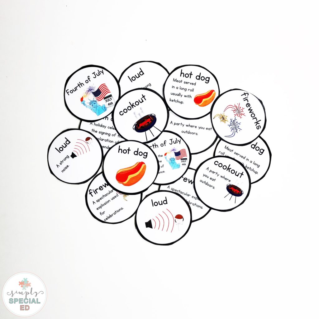 After the introduction day, we can work on the vocabulary during independent work. There are two levels of clip cards to work on the skill. Word picture matching and definition word matching.