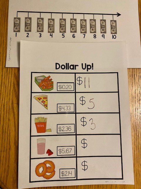 When shown a price, STUDENT will use the dollar up method to determine the number of dollars needed to make a purchase.