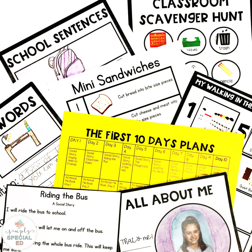 Each day our plan includes a social story. We use the full page social stories to read as a class on the white board. Then we read the smaller book (laminate for whole group or print each student a stapled copy) and complete the comprehension sheet that goes along with it. Usually the topic comes up each day of back to school season and we are able to refer to our book.