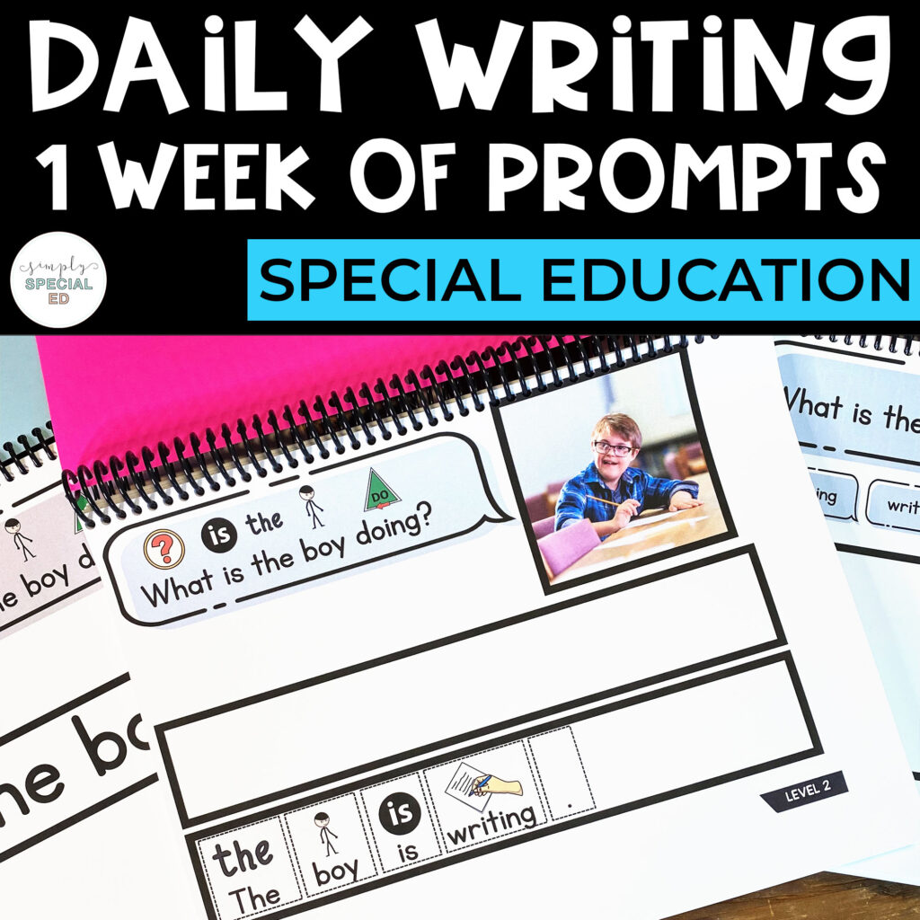 I find that learners struggle most with generating ideas during writing activities, making it difficult to teach writing. Providing options such as sentence starters, visuals, and choices can remove the pressure of idea generation. The first level of our simple daily writing curriculum provides a sentence starter and visuals to cut and paste the last word. Each sentence describes a picture and answers a question. Similarly, level two provides a picture and question prompt, but allows learners to cut and paste each word in the sentence in the correct order. Levels three and four continue to encourage learners to be more independent with their writing, with level four providing options for answers and a space for a written sentence.