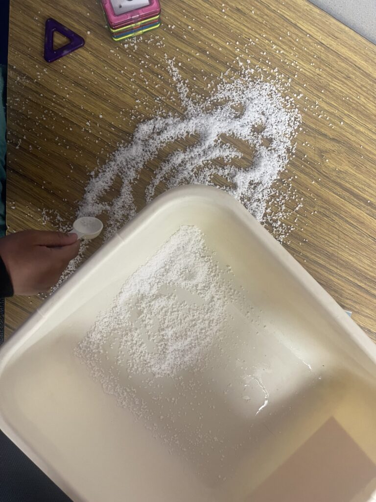 - have your student measure out the snow powder, go to the sink and add the correct amount of water, and mix the two ingredients together. this is a great way to work on follow step-by-step instructions