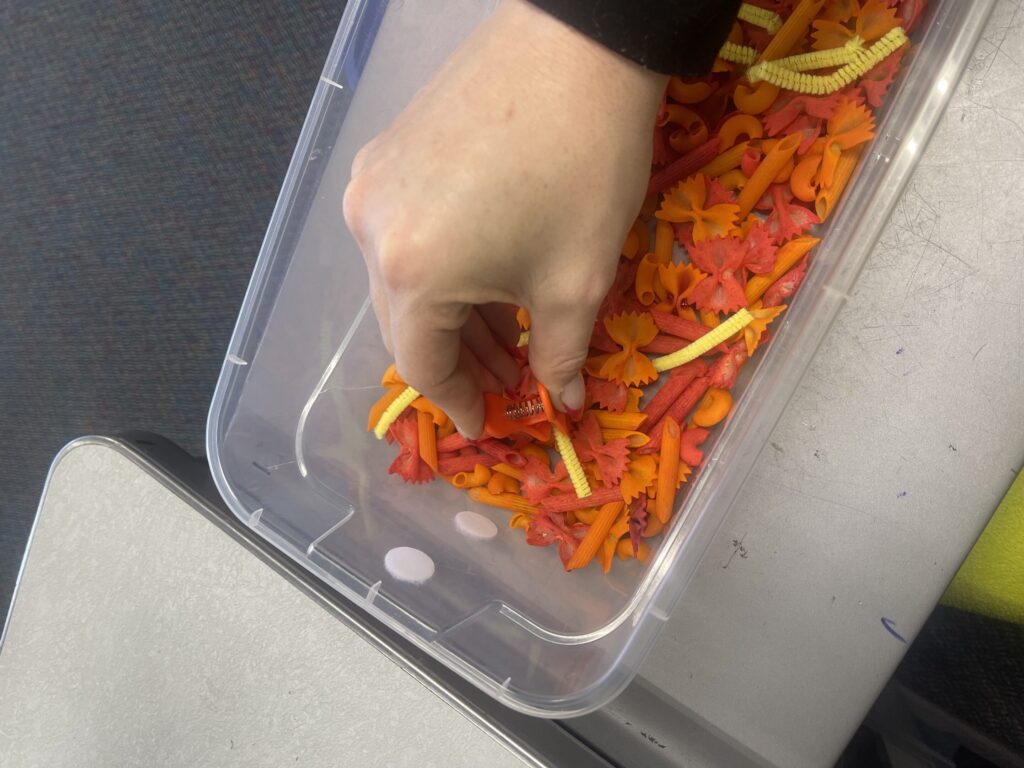 I then cut up some yellow pipe cleaners and sprinkled them throughout the bin. I then grabbed an orange jumbo tweezer for my students to use a fine motor tool to try and pinch the yellow pipe cleaners. The jumbo tweezers can be found here!