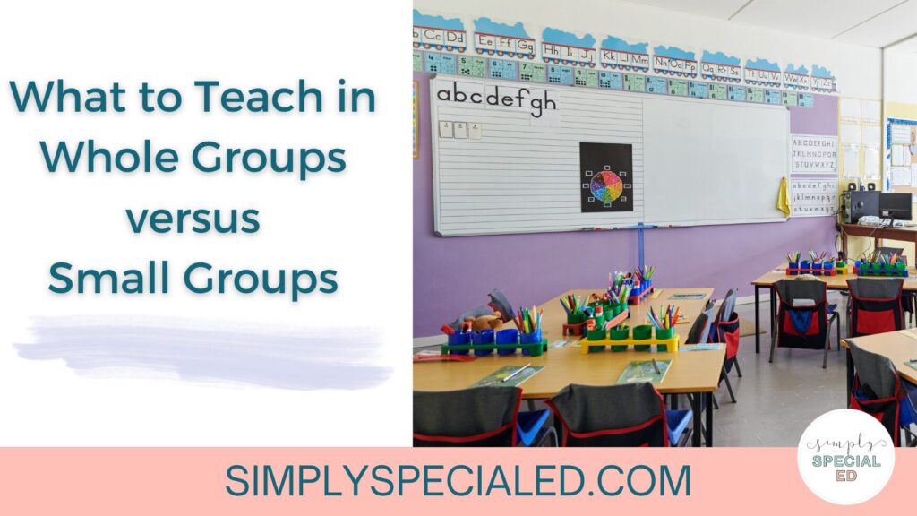 Self-contained classrooms thrive on centers! Working with my students in small groups or (or individually) gives me a chance to target exactly what they need to work on. However, there are times when I like working with my class in a whole group setting as well! Read on for examples of what I like to teach in whole groups versus in the small group setting.