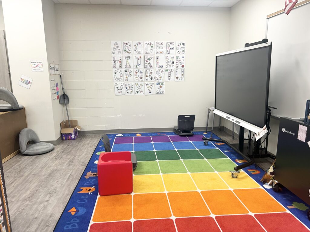 We have covered how a good floor plan can help reduce elopement outside of the designated area and the room. But, how else can a good floor plan help reduce challenging behaviors? Creating a room with different defined areas, reduced distractions, and lots of structure in the floor plan helps our students’ minds be at ease. When a student’s mind is at ease, they are less likely to engage in challenging behaviors. This is due to overwhelm, anxiety, and the unknown. See the picture below of my whole group area. It is blocked off by multiple shelves, and there are different seating options for different needs. It is clearly marked where to go for whole group time, but the students also do not have a lot space to engage in additional challenging behaviors.