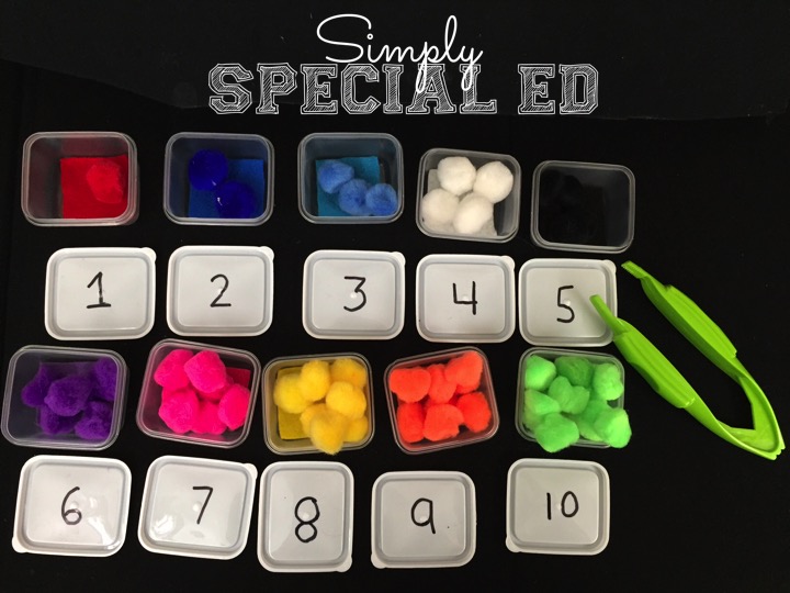 The numbers written on each container cover represent the number of pom poms for each container. I also glued matching color felt in the bottom of the container to make matching easier for my lower learners. (see below!)